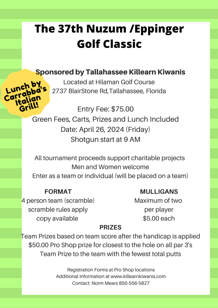 Tallahassee Killearn Kiwanis Golf Tournament Organized by Norm Mears Lunch by Carrabba’s Italian Grill REGISTRATION: The send off START YOUR ENGINES Share this: Click to share on X (Opens in new window) X Click to share on Facebook (Opens in new window) Facebook Like Loading...